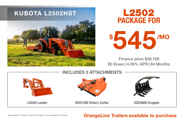 Get your hands on the ultimate property maintenance tool! A new 4WD Kubota tractor with loader, 66″ bucket, 60″ grapple with 3rd function kit, and a 60″ rotary cutter!